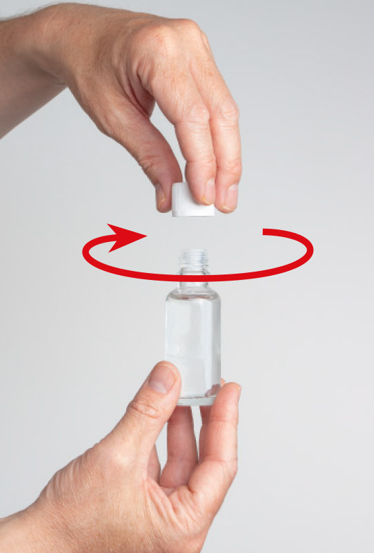 Öppna flaskan med RAVICTI genom att trycka ner locket och vrida till vänster.